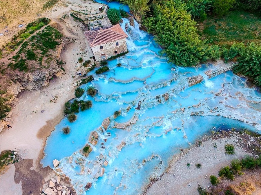 Las cascadas de Cascate del Mulino y el balneario termal de Terme di Saturnia son una atracción popular en el sur de la Toscana. El agua -que ronda los 99 grados- ha burbujeado en pequeñas piscinas sobre las rocas de travertino a lo largo de los siglos y se dice que cura casi todo, desde el acné hasta la amigdalitis.