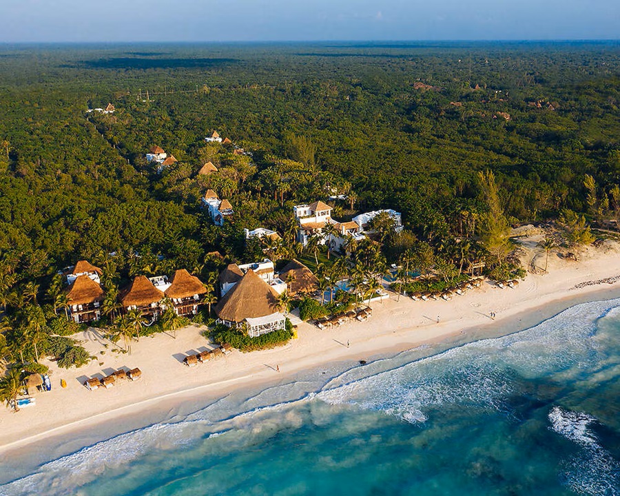 Costo aproximado: $1.000–$2.200 USD por noche (media pensión). Es el hotel boutique de Tulum con las vistas al mar más puras y relajantes.