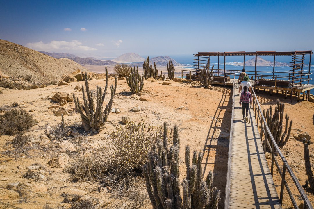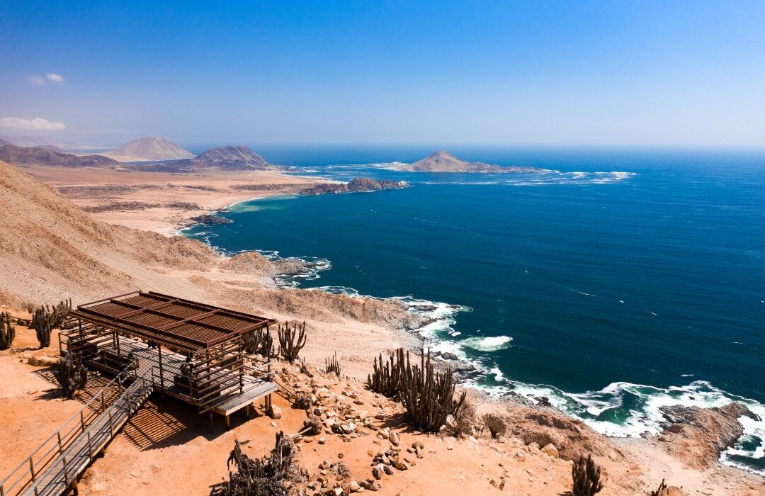 El Sendero de la Costa en el Parque Nacional Pan de Azúcar es un recorrido de 10 km (ida y vuelta) por acantilados de 100–150 m sobre el Pacífico, con vistas de olas rompiendo contra rocas negras y colonias de pingüinos de Humboldt. El sendero serpentea entre cactus y desierto costero, con miradores que parecen colgar sobre el mar. Dificultad media, con ascensos moderados.