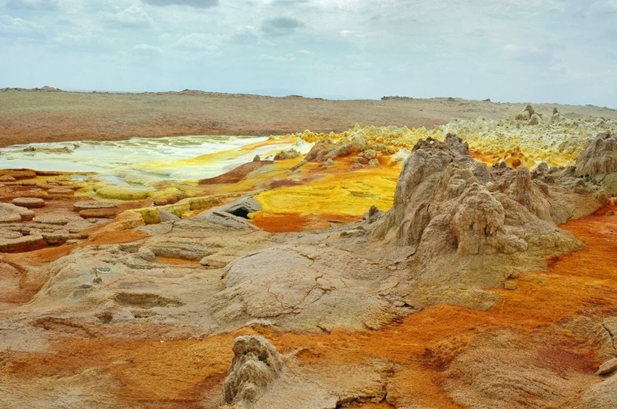 Considerada uno de los lugares más extremos del planeta, la Depresión de Danakil presenta un paisaje surrealista con volcanes activos, lagos de lava y géiseres de azufre.