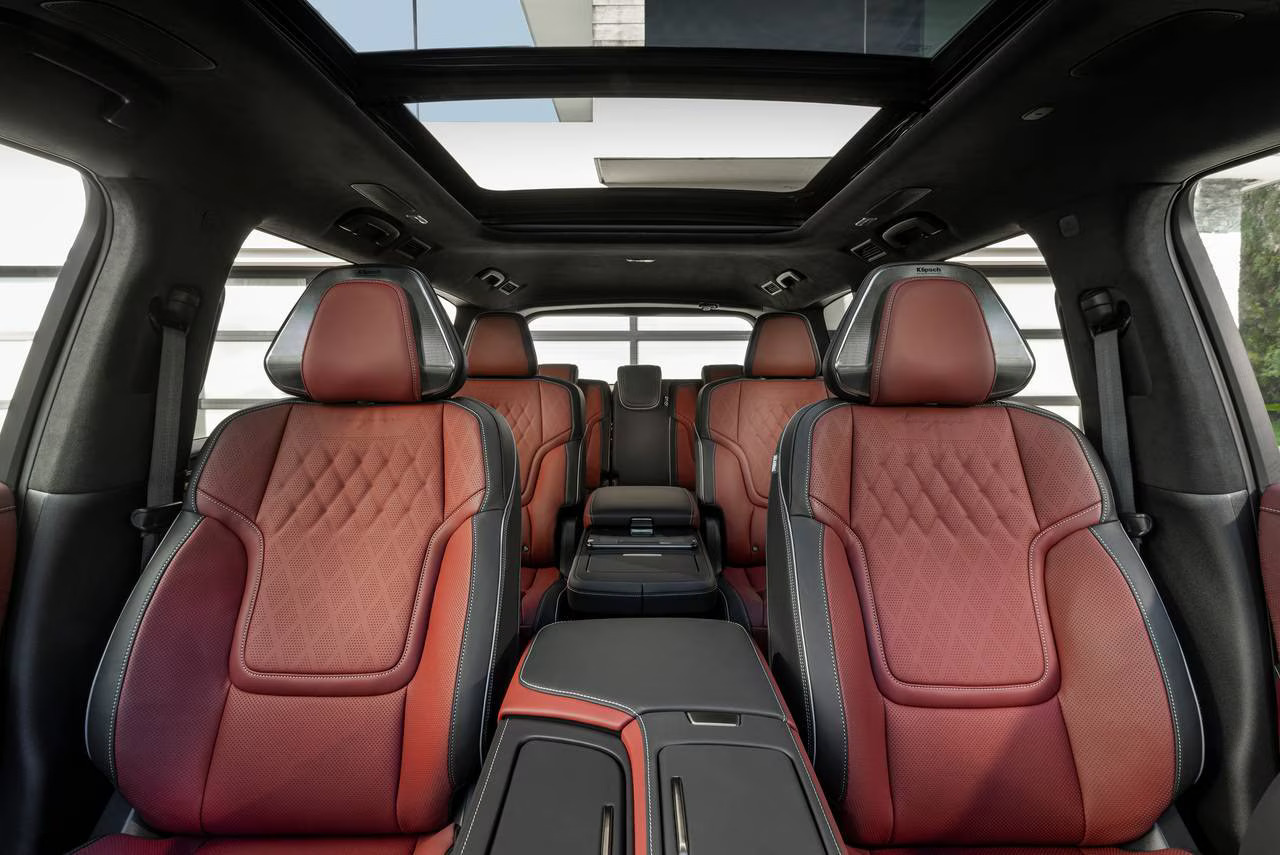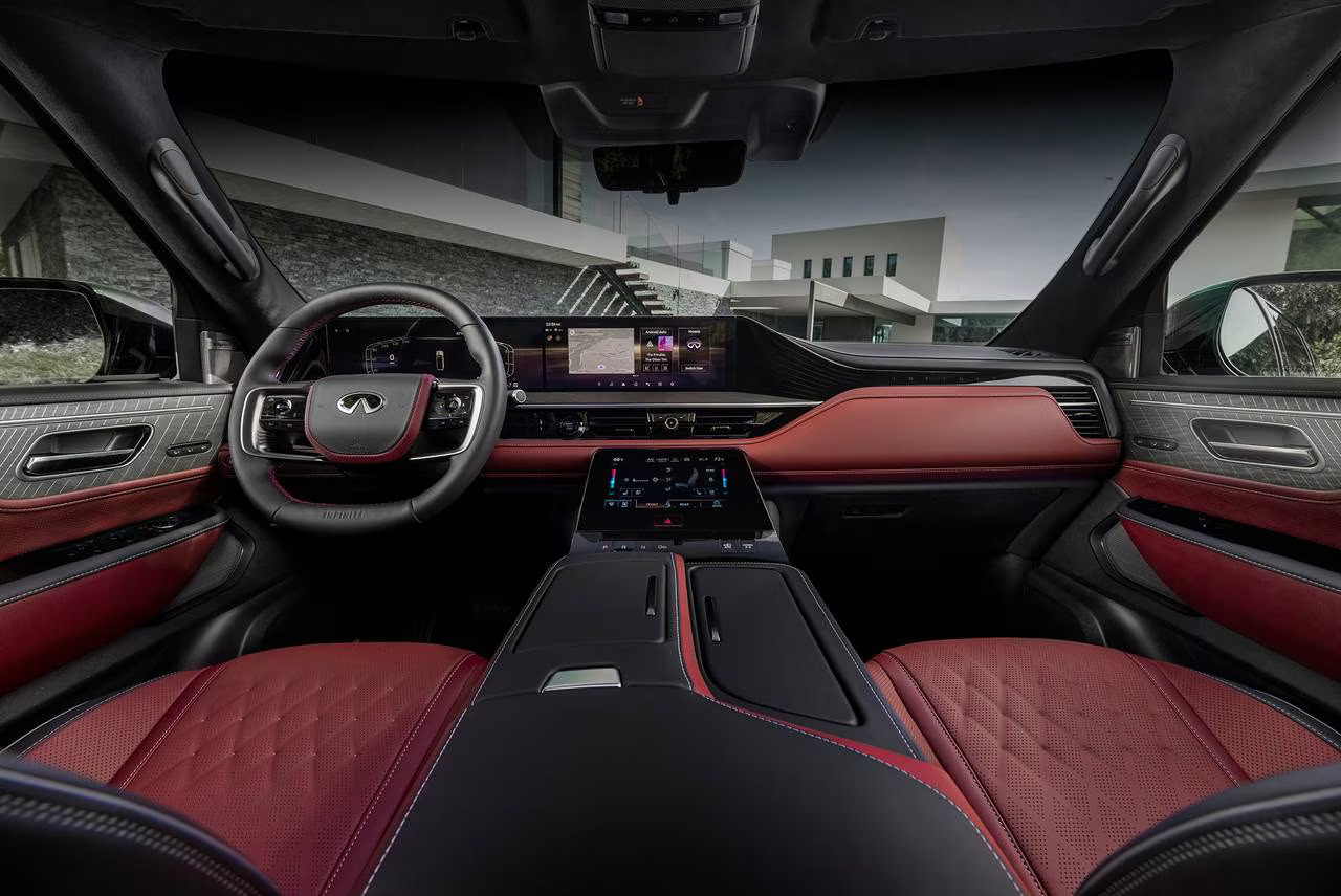 El interior es espacioso y atractivo. La tercera fila no es enorme, pero los adultos deberían estar cómodos en la parte trasera para viajes cortos. Es fácil entrar y salir gracias a los asientos deslizantes de la segunda fila y a la suspensión neumática de serie. Esta última baja el QX80 cuando está aparcado para facilitar el acceso al interior.