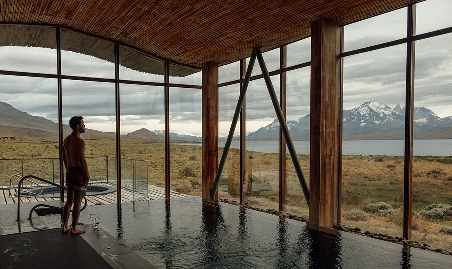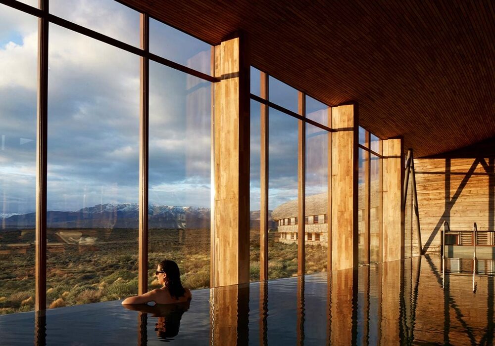 Tierra Patagonia es un hotel boutique de lujo sostenible frente al Parque Nacional Torres del Paine, con vistas directas a las Torres y al lago Sarmiento. Sus habitaciones minimalistas con ventanales piso-techo permiten contemplar el paisaje desde la cama, y el spa con piscina infinita y tratamientos inspirados en la naturaleza patagónica crea un ambiente de paz absoluta.