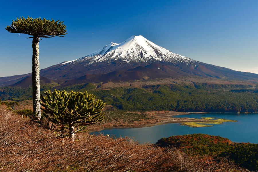 4. Volcán Llaima, Conguillío: Ruta en parque con lago y araucarias