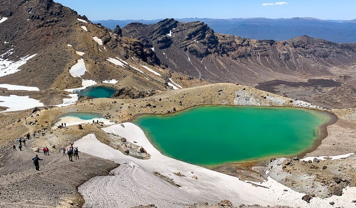 La ruta Tongariro Alpine Crossing es una de las caminatas más famosas del mundo, donde los senderos te llevan a lagos de colores brillantes como el Lago Esmeralda, campos de lava y cráteres humeantes.