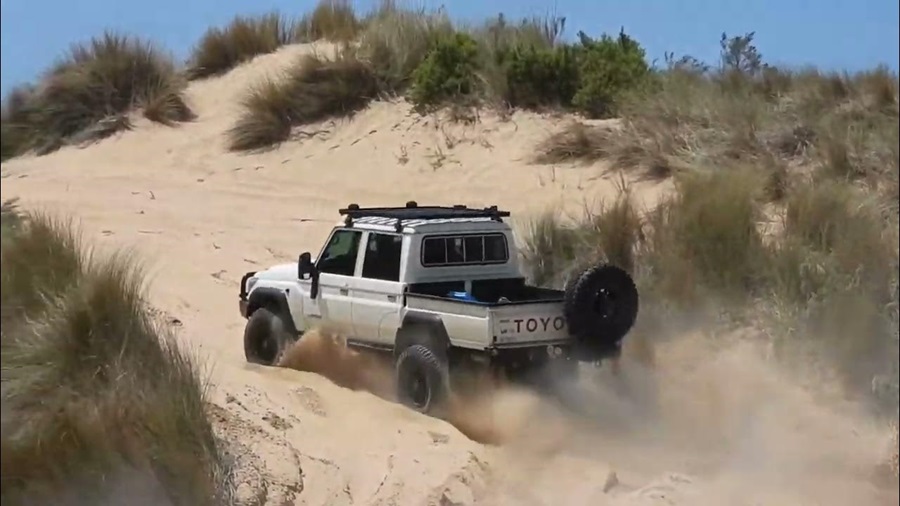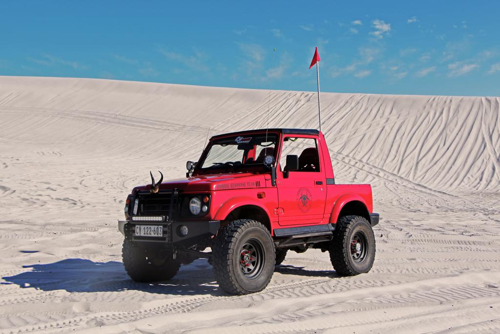 El Suzuki Samurai es un modelo clásico que sigue siendo popular gracias a su peso ligero (2.000 lbs) y maniobrabilidad excepcional en dunas. Su sistema 4×4 mecánico y dimensiones compactas evitan que se entierre fácilmente en arena suelta.