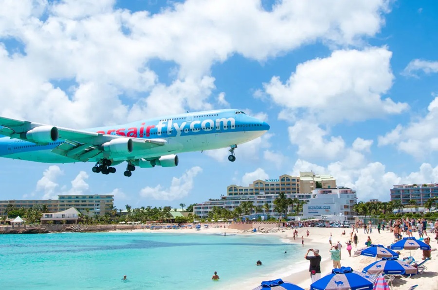 Esta playa caribeña, famosa por sus aguas turquesas, se ha convertido en un lugar peligroso e incómodo debido a su cercanía con el aeropuerto Princesa Juliana. Los aviones comerciales (incluyendo Boeing 747 y Airbus A340) aterrizan a solo 25 metros sobre la playa, generando turbinas que levantan tormentas de arena, vuelan sombrillas y alcanzan niveles de ruido de 120 decibeles (equivalentes a un concierto de rock).
